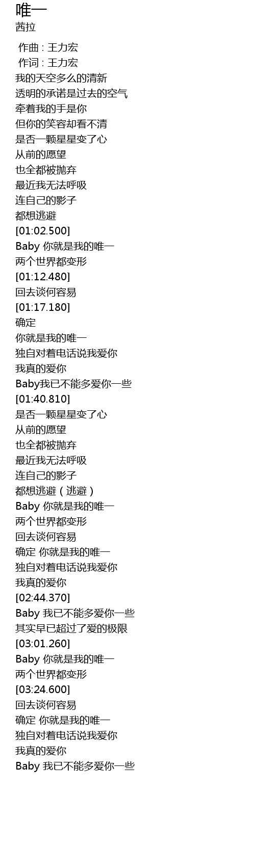 | [03:15.170] | Baby nǐ jiù shì wǒ de wéi yī |