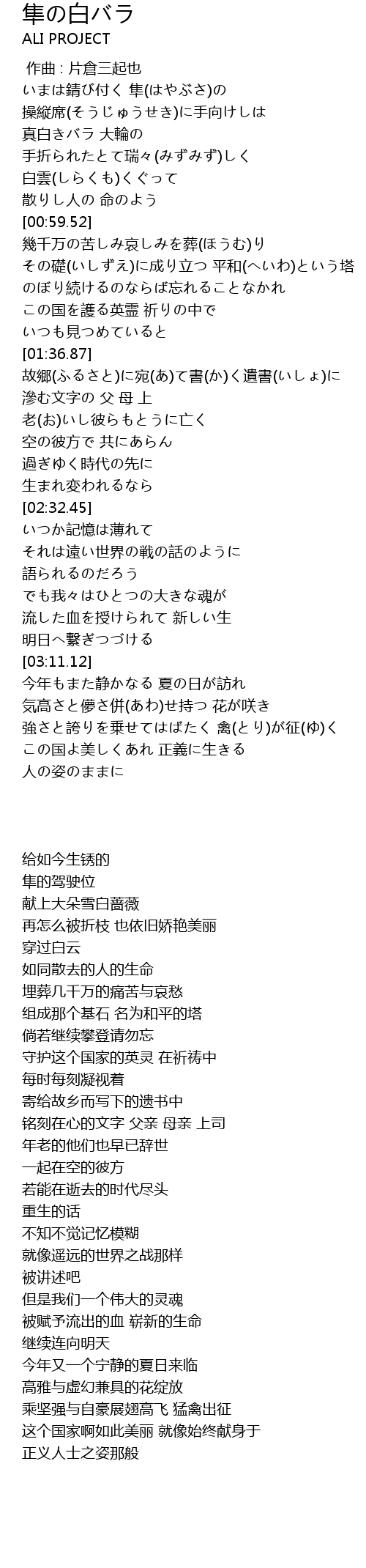 | [01:08.06] | その礎(いしずえ)に成り立つ 平和(へいわ)という塔 |