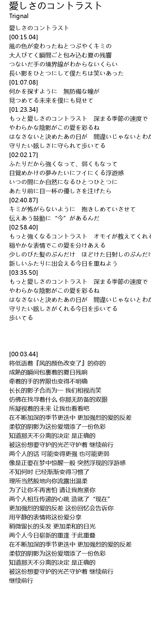 | [02:58.83] | もっと強くなるコントラスト オモイが教えてくれるね |