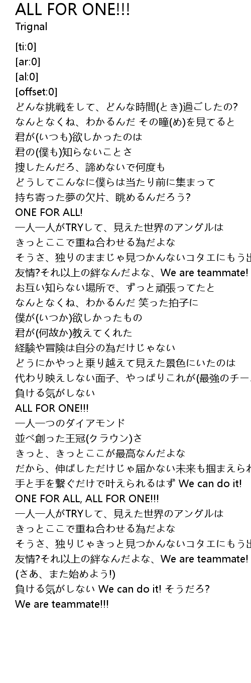 | [03:14.17] | ONE FOR ALL, ALL FOR ONE!!! |