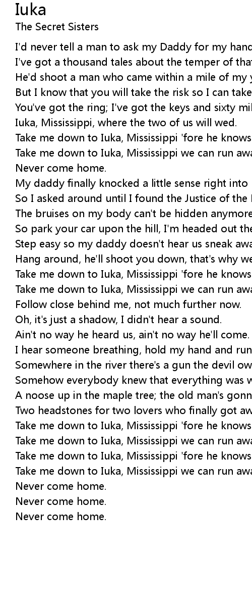 Take me down to Iuka, Mississippi we can run away and never come home. |
