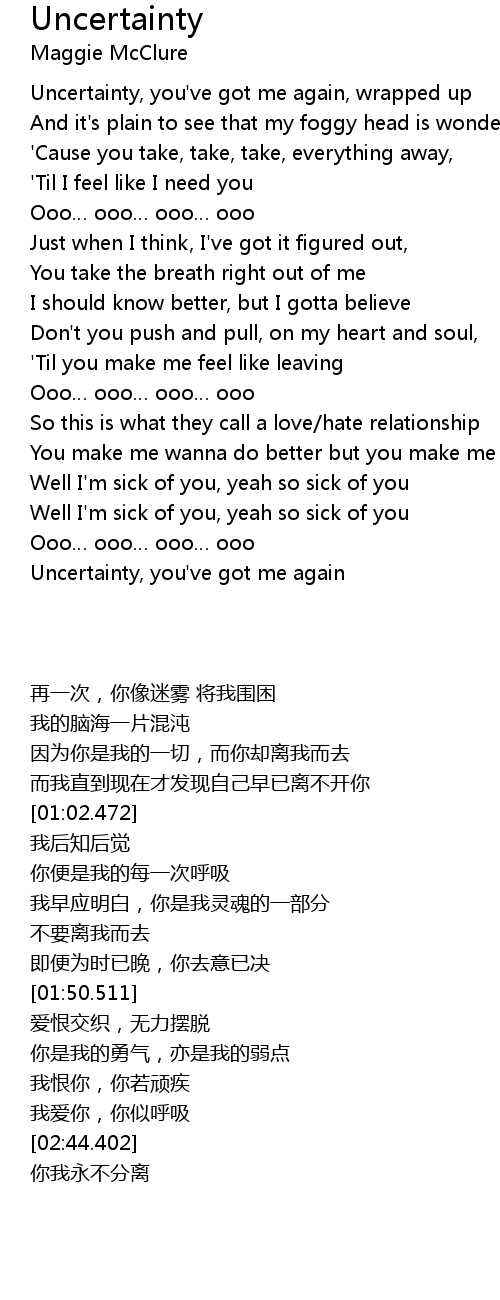 | [03:19.771] | Uncertainty, you' ve got me again |