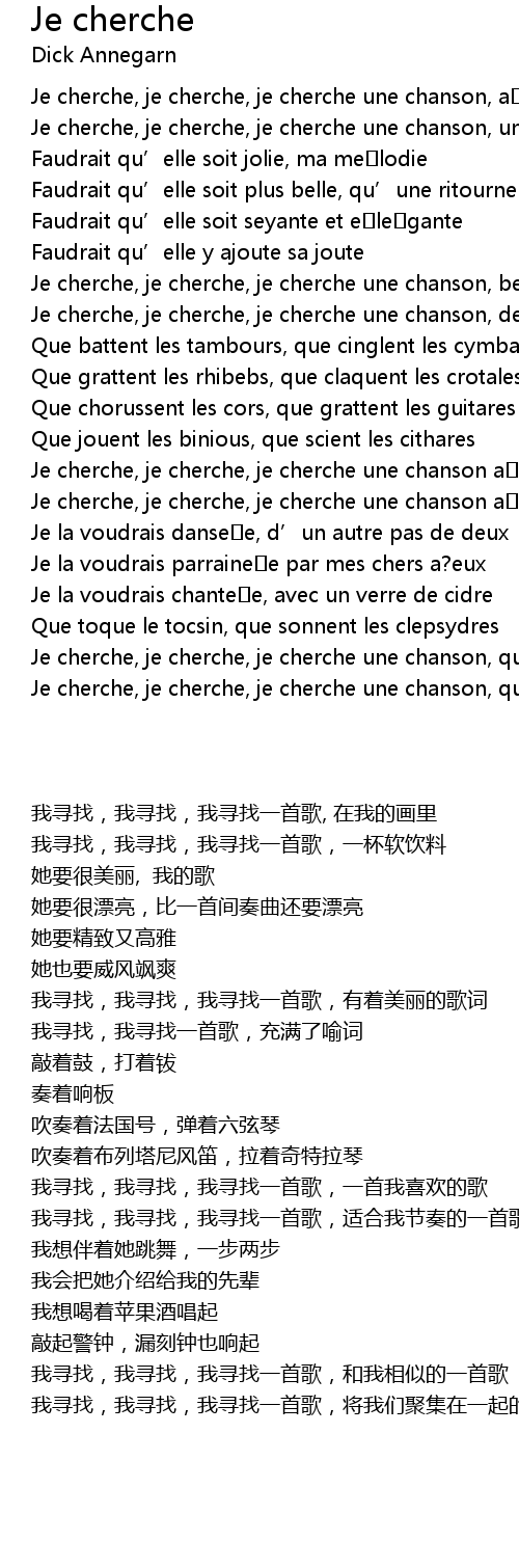 | [01:36.385] | Je cherche, je cherche, je cherche une chanson a ma convenance |