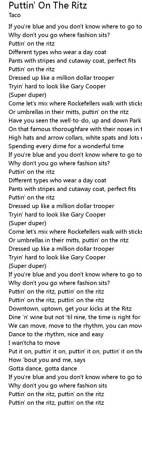 | Put it on, puttin' it on, puttin' it on, puttin' it on the R I T Z | |