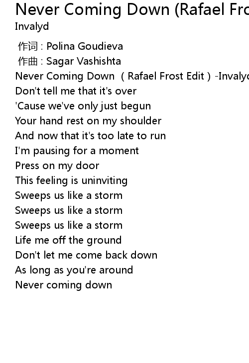 | [00:00.486] | Never Coming Down (Rafael Frost Edit)-Invalyd/Polina |