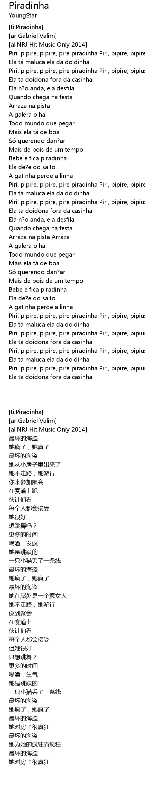 | [01:58.95] | Piri, pipire, pipire, pire piradinha Piri, pipire, pipius, |
