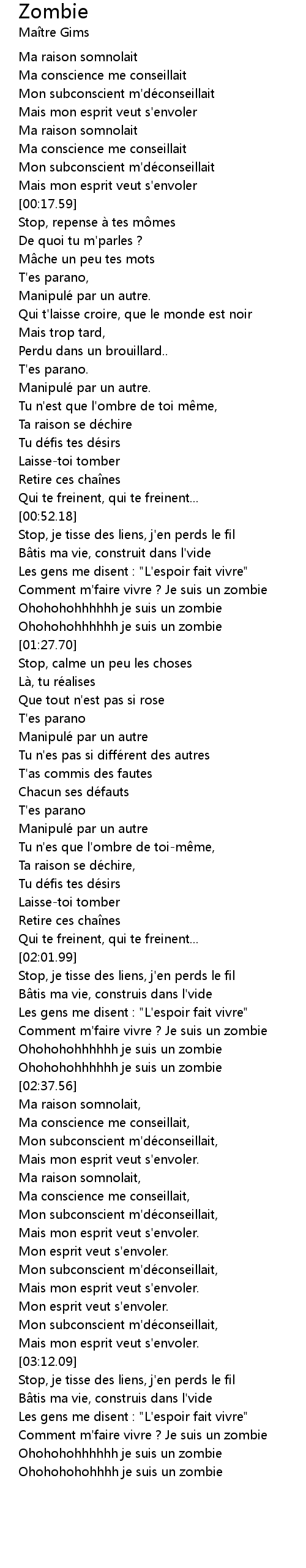 | [02:16.52] | Comment m' faire vivre ? Je suis un zombie |