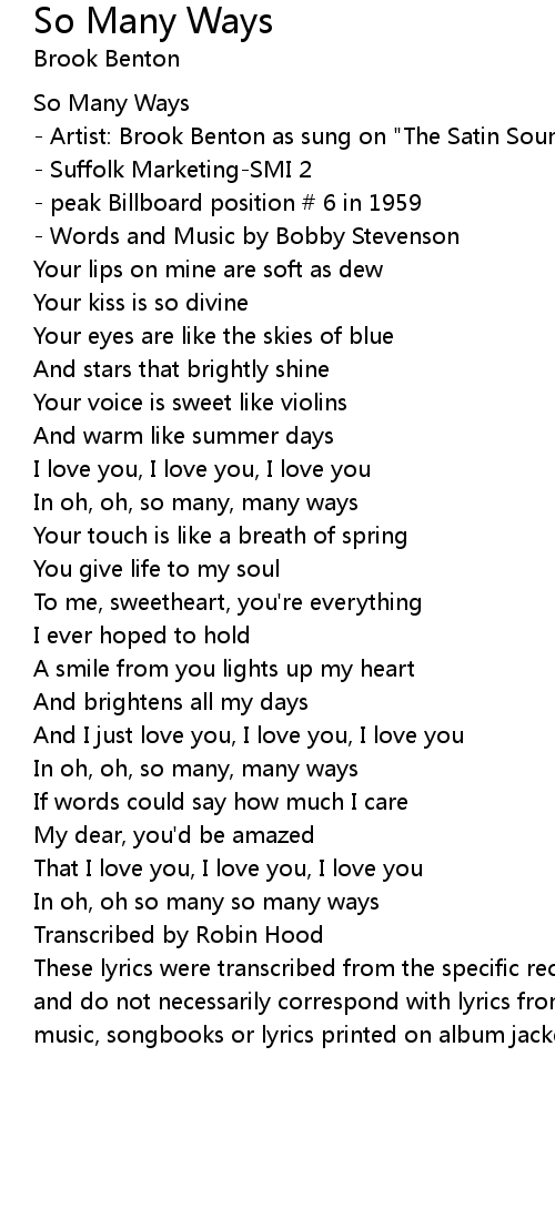 - Artist: Brook Benton as sung on "The Satin Sound Brook Benton" |