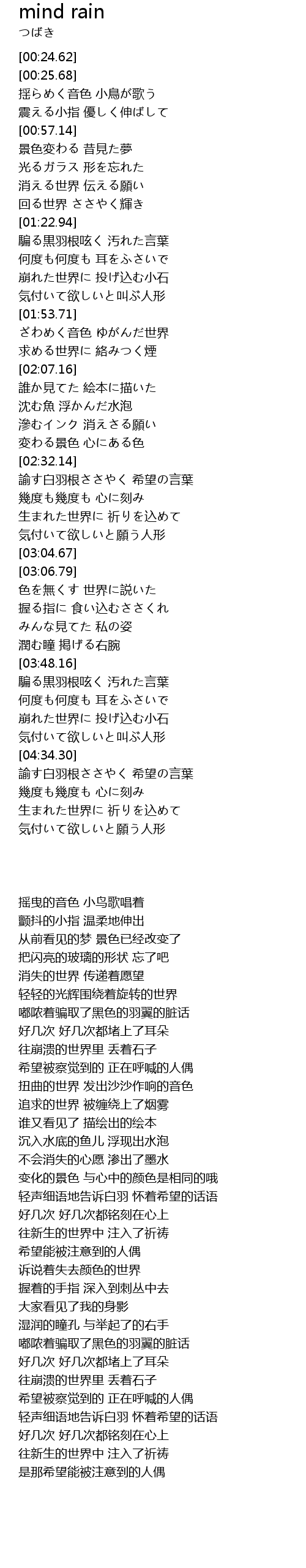 | [04:34.62] | 轻声细语地告诉白羽 怀着希望的话语 |