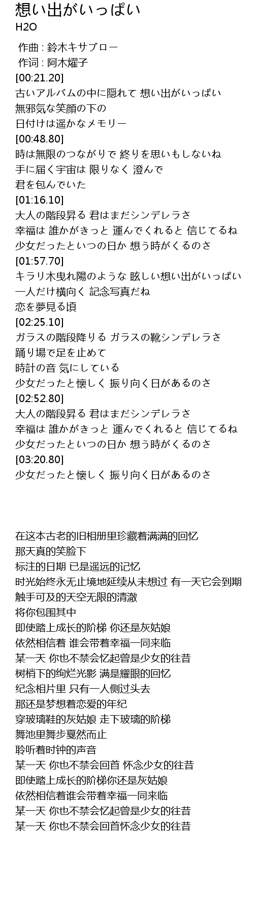 | [00:21.26] | 古いアルバムの中に隠れて 想い出がいっぱい |