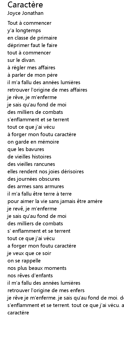 | je r ve je m' enferme. je sais qu' au fond de moi. des milliers de combats. s' enflamment et se terrent. tout ce que j' ai ve cu. a forger mon foutu caracte re |