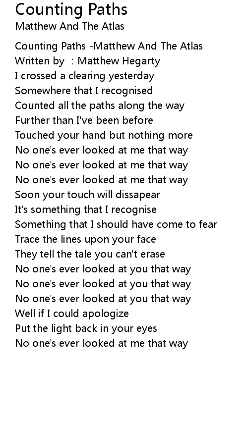 | [00:00.123] | Counting Paths -Matthew And The Atlas |