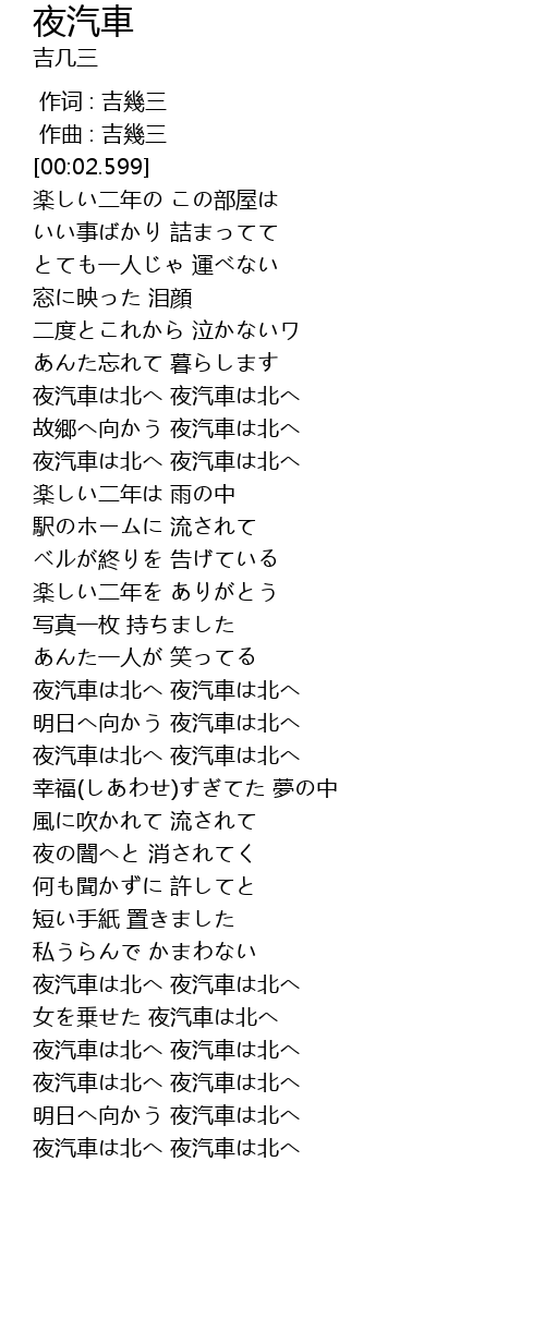 | [03:05.770] | 夜汽車は北へ 夜汽車は北へ |