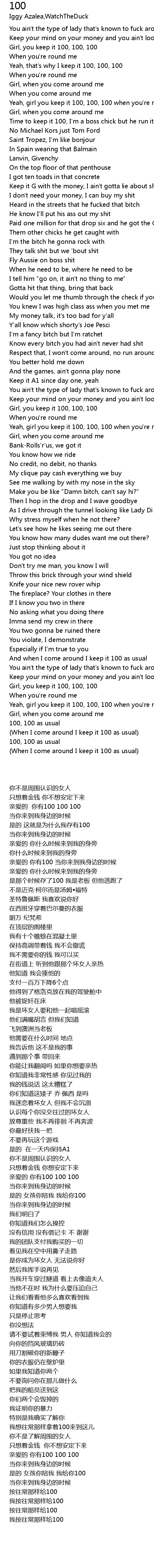 Yeah, that's why I keep it 100, 100, 100 |