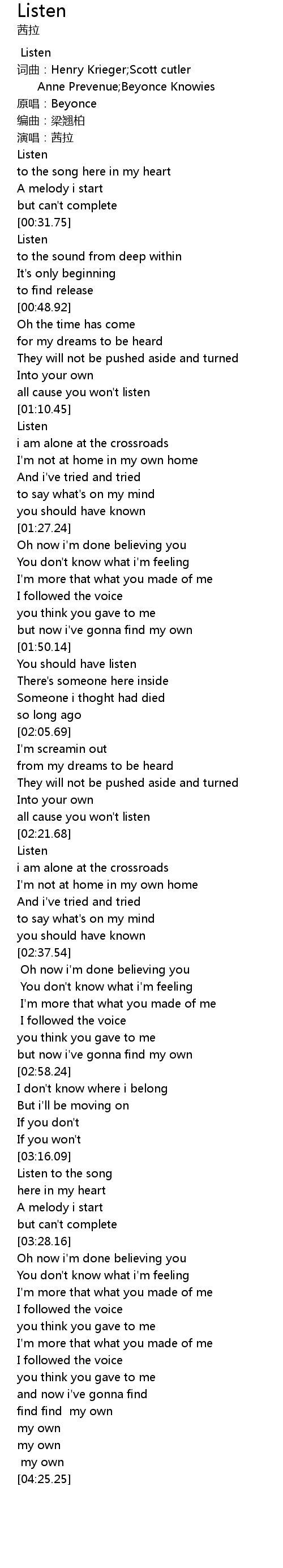 | [00:01.29] | 词曲:Henry Krieger;Scott cutler |