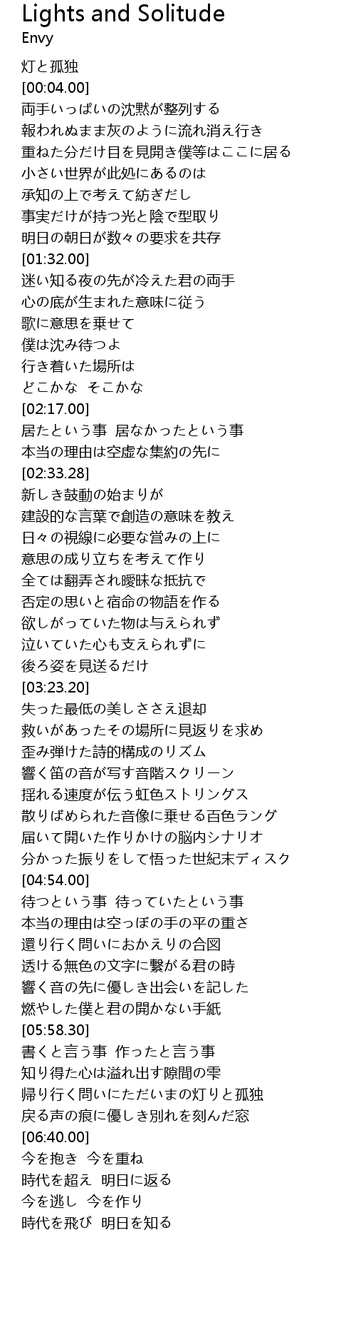 | [06:20.00] | 帰り行く問いにただいまの灯りと孤独 |