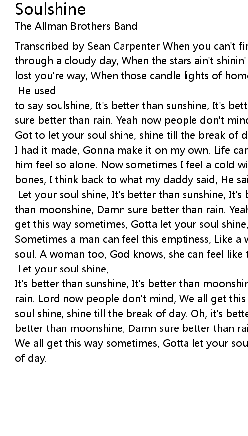 Transcribed by Sean Carpenter When you can't find the light, That got you through a cloudy day, When the stars ain't shinin' bright, You feel like you've lost you're way, When those candle lights of home, Burn so very far away, Now you got to let your soul shine, Just like my daddy used to say. [Chorus] He used to say soulshine, It's better than sunshine, It's better than moonshine, Damn sure better than rain. Yeah now people don't mind, We all get this way sometime, Got to let your soul shine, shine till the break of day. I grew up thinkin' that I had it made, Gonna make it on my own. Life can take the strongest man, Make him feel so alone. Now sometimes I feel a cold wind, Blowin' through my achin' bones, I think back to what my daddy said, He said "Boy, in the darkness before the dawn:" [Chorus] Let your soul shine, It's better than sunshine, It's better than moonshine, Damn sure better than rain. Yeah now people don't mind, We all get this way sometimes, Gotta let your soul shine, shine till the break of day. Sometimes a man can feel this emptiness, Like a woman has robbed him of his very soul. A woman too, God knows, she can feel like this. And when your world seems cold, you got to let your spirit take control. [Chorus] Let your soul shine, It's better than sunshine, It's better than moonshine, Damn sure better than rain. Lord now people don't mind, We all get this way sometimes, Gotta let your soul shine, shine till the break of day. Oh, it's better than sunshine, It's better than moonshine, Damn sure better than rain. Yeah now people don't mind, We all get this way sometimes, Gotta let your soul shine, shine till the break of day. |