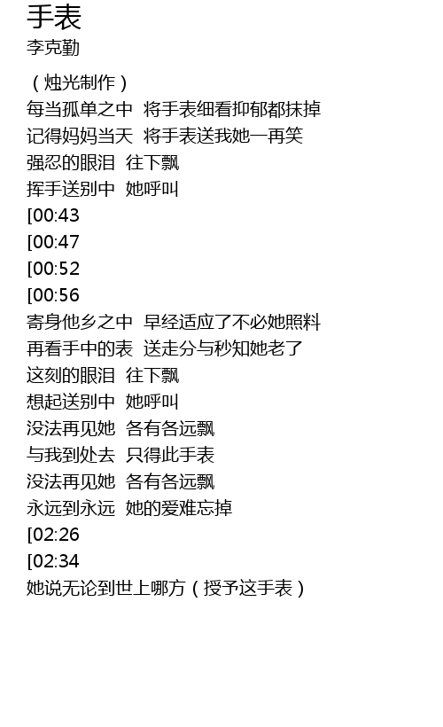 | [00:25] | 记得妈妈当天 将手表送我她一再笑 |