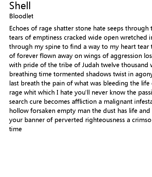 Echoes of rage shatter stone hate seeps through the cracks of wisdom molten tears of emptiness cracked wide open wretched inside out arcane fingers rip through my spine to find a way to my heart tear through the emptiness in search of forever flown away on wings of aggression lost in a cavernous tomb adorned with pride of the tribe of Judah twelve thousand were sealed I stand alone breathing time tormented shadows twist in agony at the tortured heaves of loves last breath the pain of what was bleeding the life out you'll never know the rage whit which I hate you'll never know the passion with which I love in my search cure becomes affliction a malignant infestation burrows through the soul hollow forsaken empty man the dust has life and the wind a soul still you carry your banner of perverted righteousness a crimson smile I stand alone breathing time |