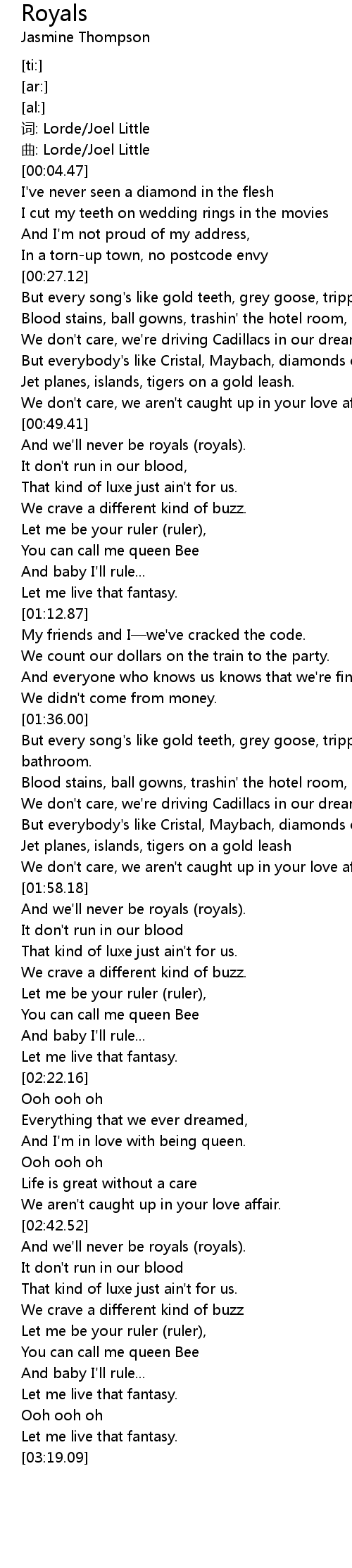| [02:42.71] | And we' ll never be royals royals. |