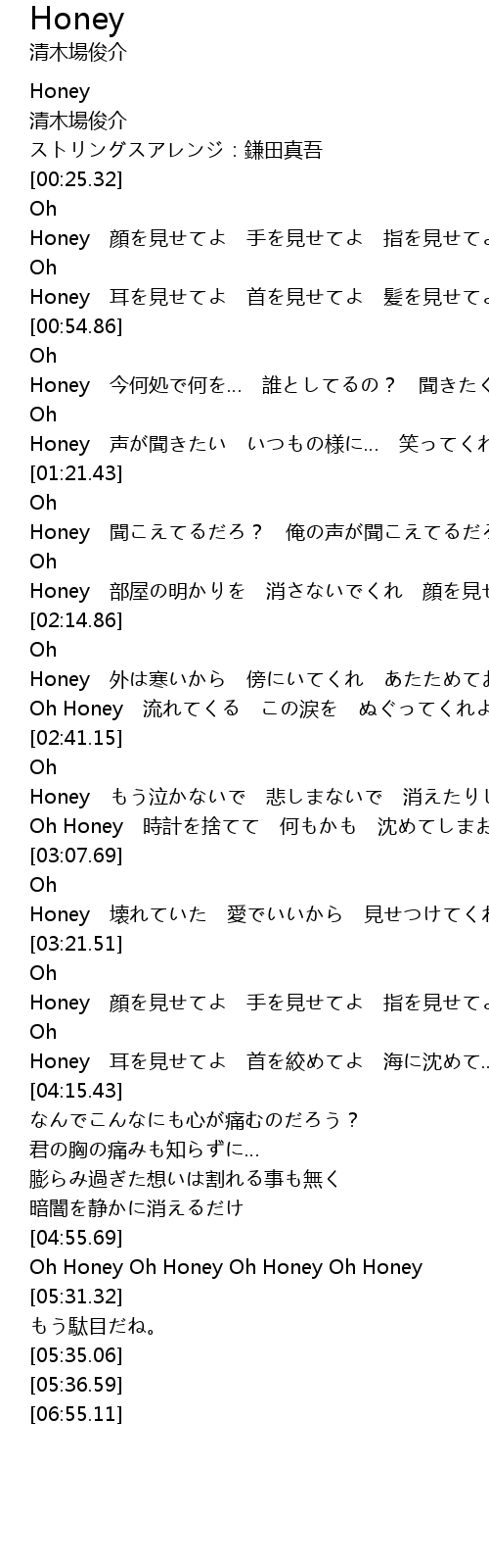 | [04:03.31] | Oh Honey 耳を見せてよ 首を絞めてよ 海に沈めて… |