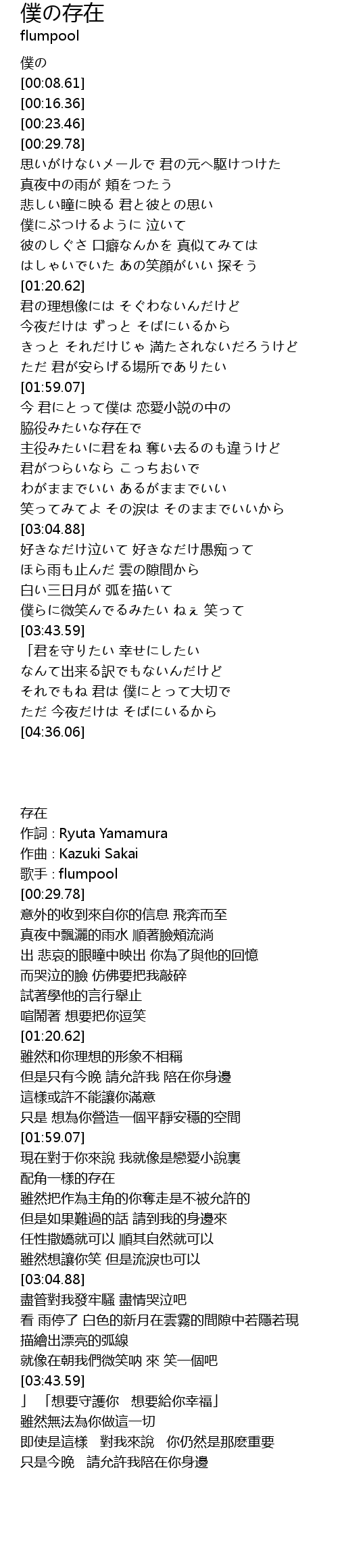 | [00:08.61] | 作詞∶Ryuta Yamamura |