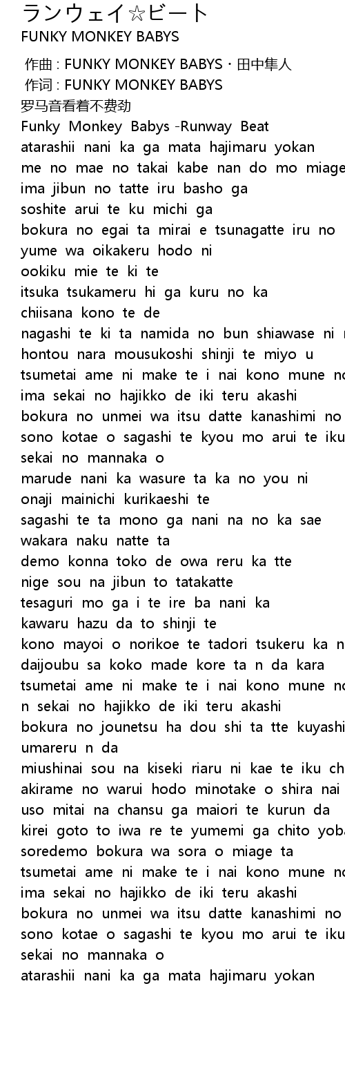 | [00:00.385] | zuò cí : FUNKY MONKEY BABYS |