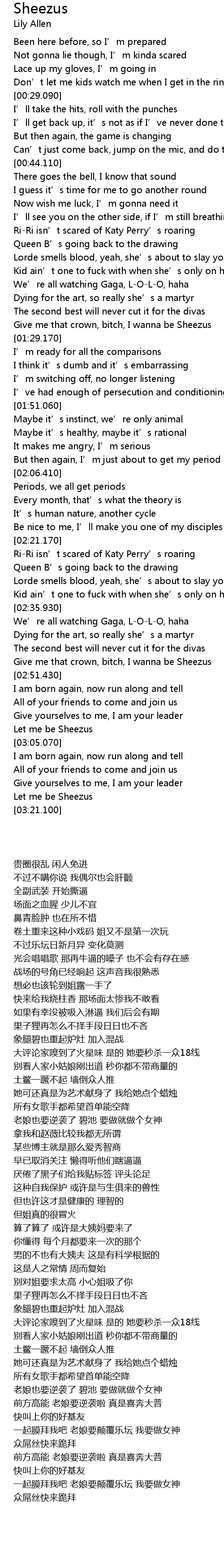 | [02:47.750] | Give me that crown, bitch, I wanna be Sheezus |