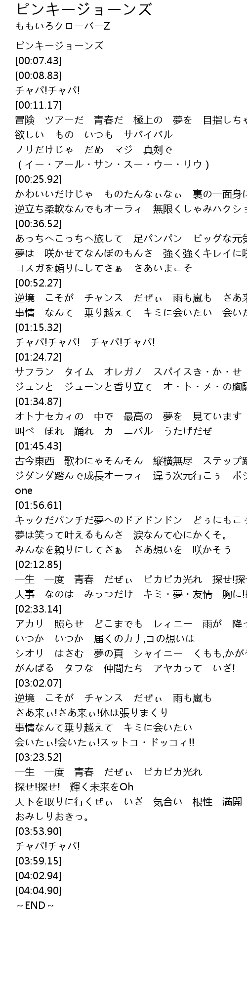 | [02:24.55] | 大事 なのは みっつだけ キミ・夢・友情 胸に!抱いて! スットコ・ドッコィ!! |