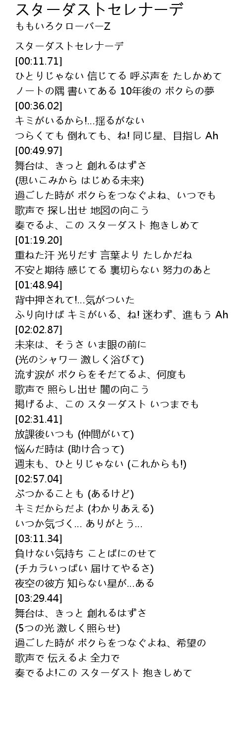 | [03:53.52] | 奏でるよ!この スターダスト 抱きしめて |