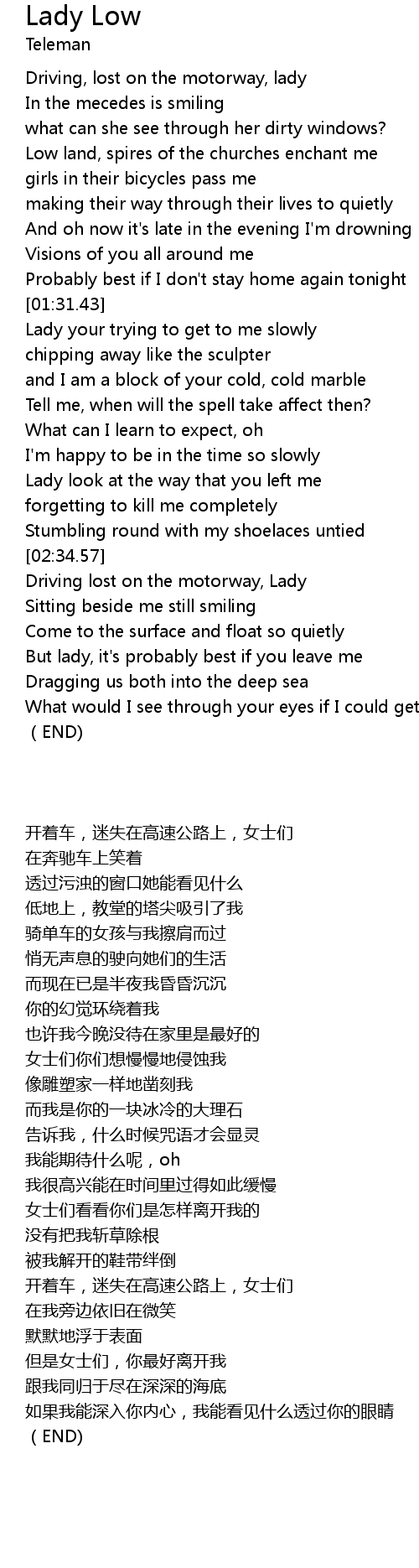 | [03:00.85] | Driving lost on the motorway, Lady |