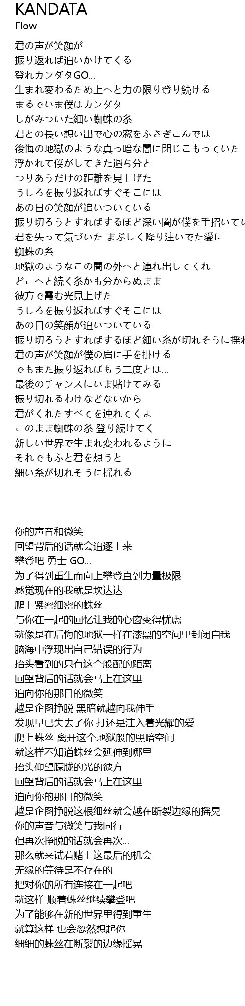 | [01:34.030] | 蜘蛛の糸 地獄のようなこの闇の外へと連れ出してくれ |