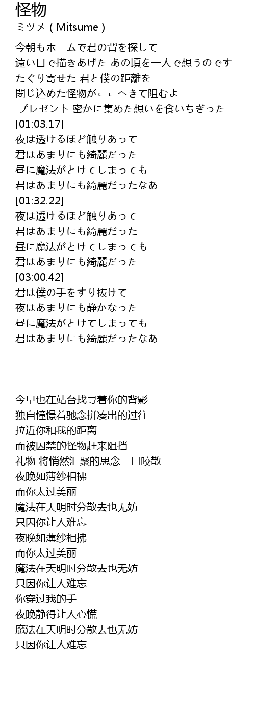 | [03:18.34] | 君はあまりにも綺麗だったなあ |