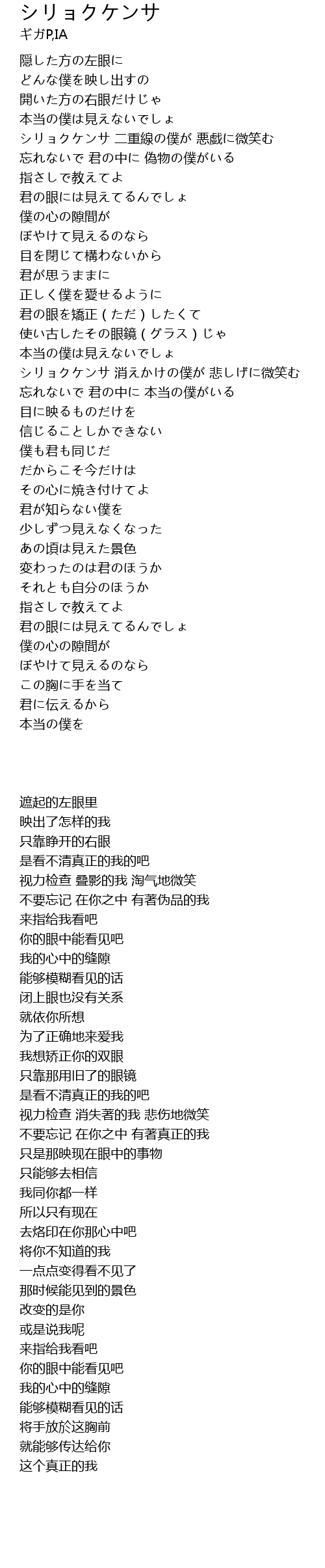 | [02:42.600] | シリョクケンサ 消えかけの僕が 悲しげに微笑む |