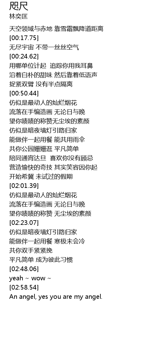 | [03:03.79] | An angel, yes you are my angel. |