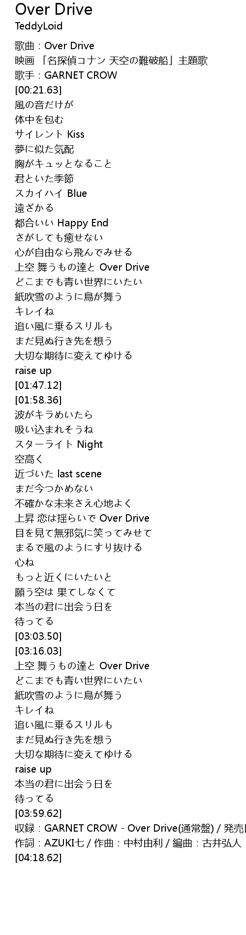 | [04:01.62] | shōu lù: GARNET CROW Over Drive tōng cháng pán fā mài rì: 2010 04 14 |