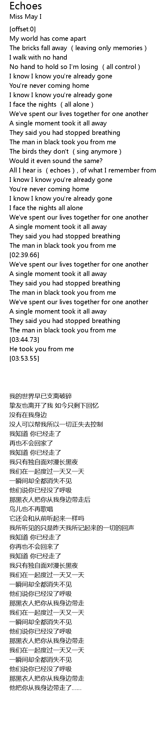 | [01:41.26] | 我所听见的只是昨天我所记起来的一切的回声 |
