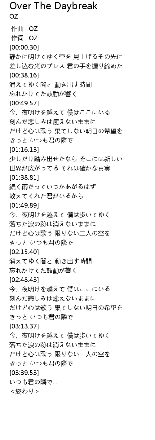 | [00:50.95] | 今、夜明けを越えて 僕はここにいる |