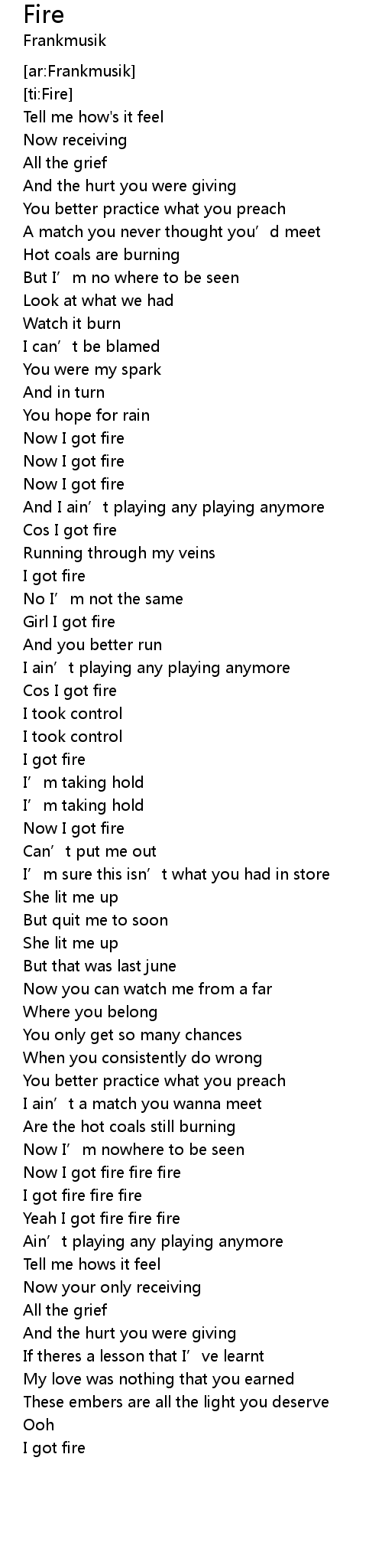 | [01:49.42] | Now I got fire |