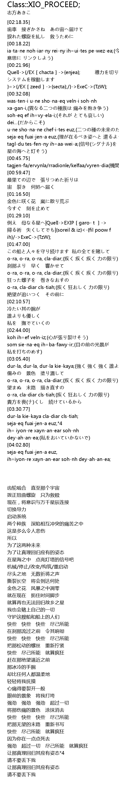 | [03:13.09] | o-ra, o-ra, o-ra, cla-diar;(疾く 疾く 疾く 力の限り) |