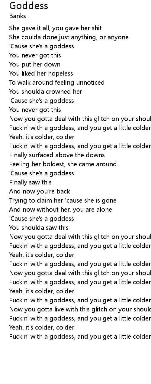 | [01:03.33] | Fuckin' with a goddess, and you get a little colder |