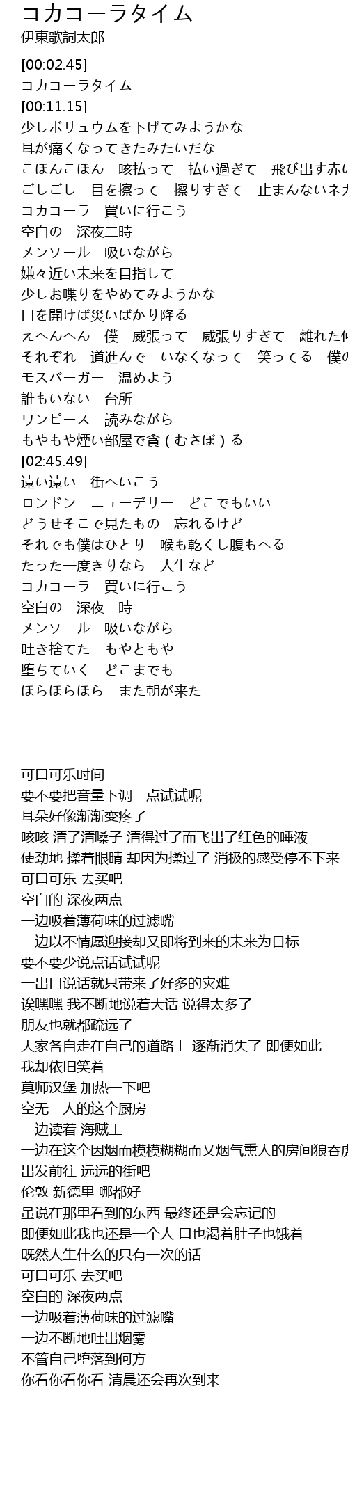 | [00:43.45] | こほんこほん 咳払って 払い過ぎて 飛び出す赤い唾 |