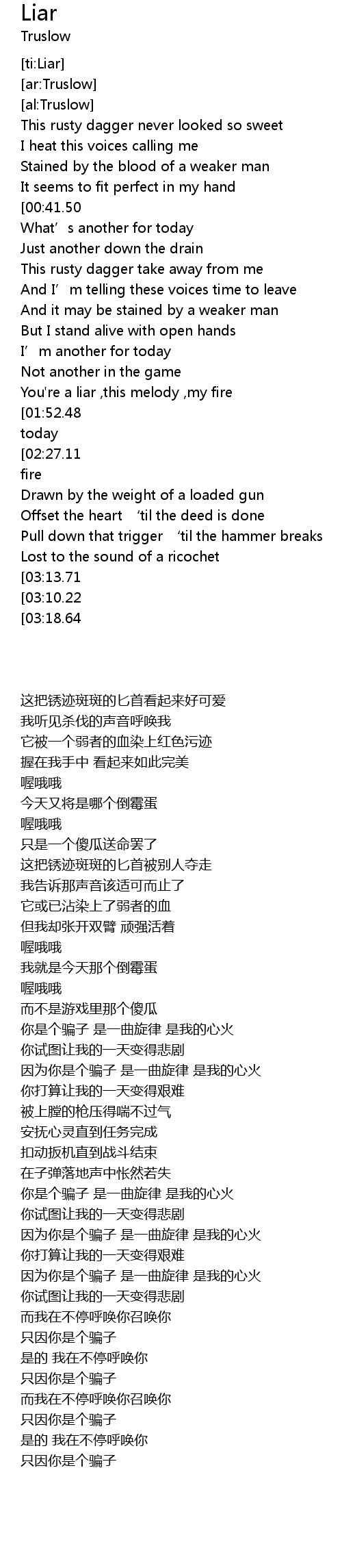 | [01:46.62][02:27.11][02:38.31][02:50.32] | ‘Cause you're a liar,this melody ,my fire |