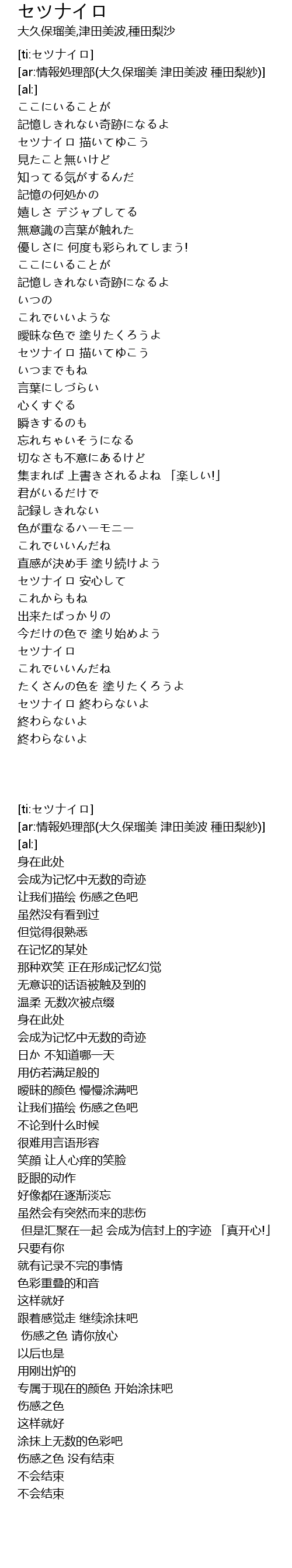 | [00:11.29] | セツナイロ 描いてゆこう |