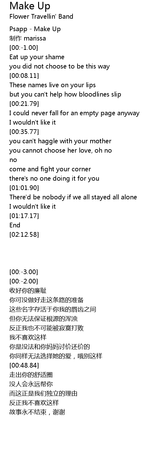 | [01:07.43] | There'd be nobody if we all stayed all alone |