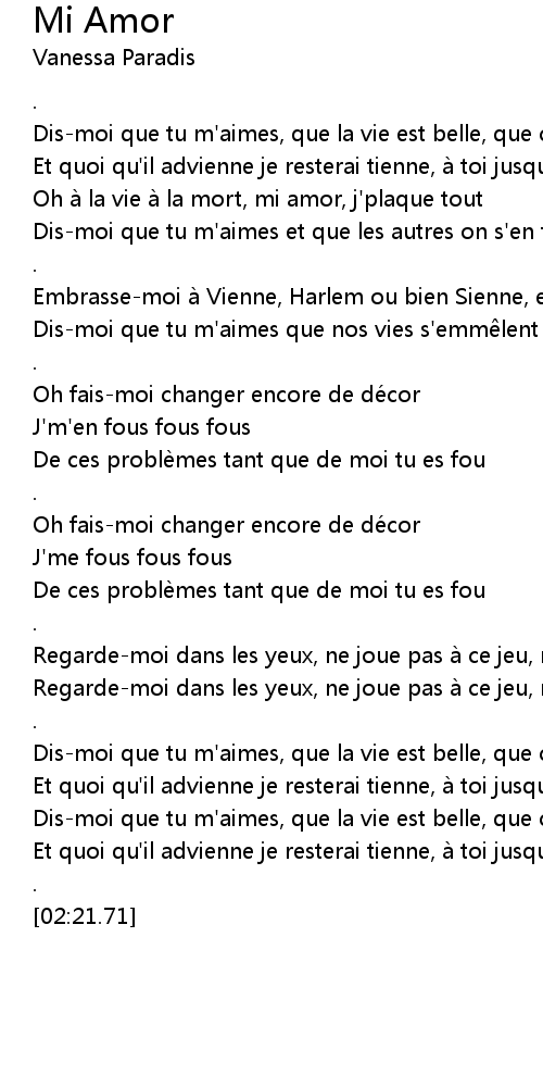 | [00:08.17] | Dis-moi que tu m'aimes, que la vie est belle, que ce monde est fou |
