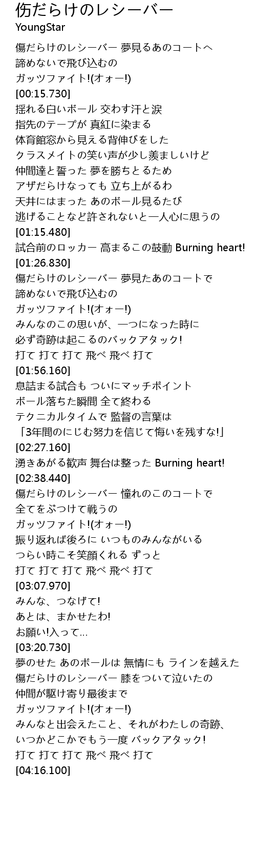 | [00:03.960] | 傷だらけのレシーバー 夢見るあのコートへ |