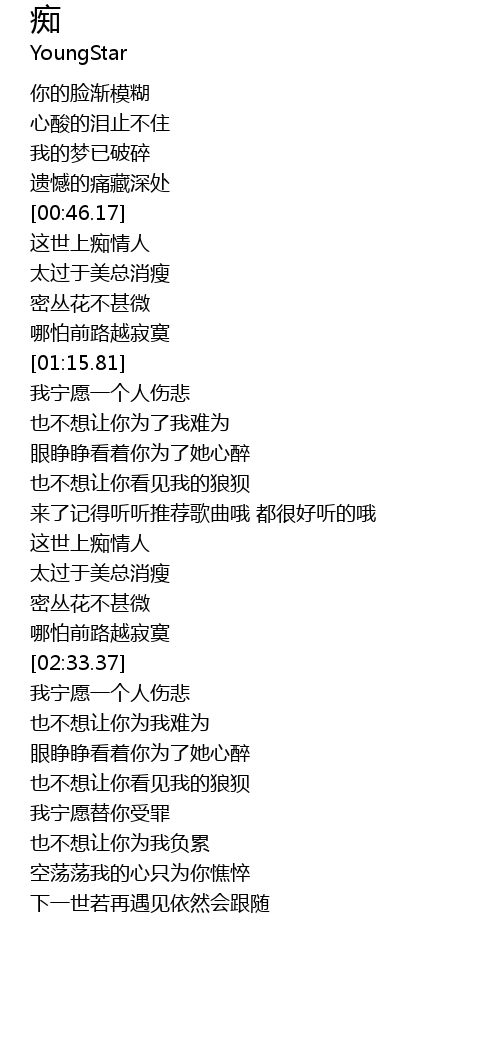 | [01:35.18] | 眼睁睁看着你为了她心醉 |