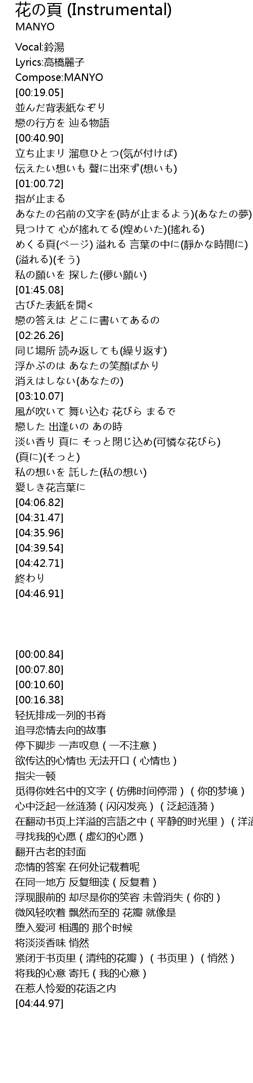 | [03:31.04] | 淡い香り 頁に そっと閉じ込め(可憐な花びら) (頁に)(そっと) |