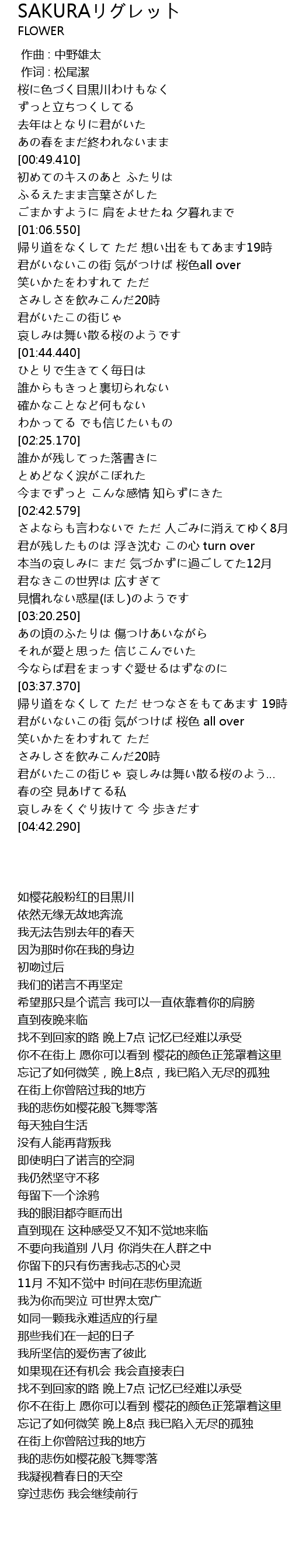 | [04:21.790] | 在街上你曾陪过我的地方 我的悲伤如樱花般飞舞零落 |